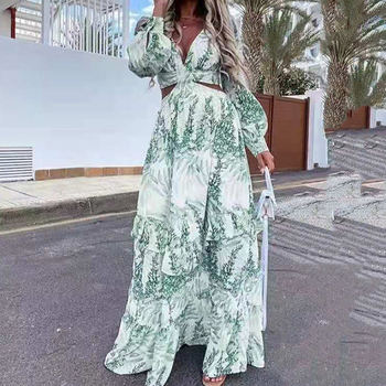 Custom Summer Casual manica lunga Vestido Normal Ladies Frock Women Deep v-neck Cut Out Floral Print Maxi Dress